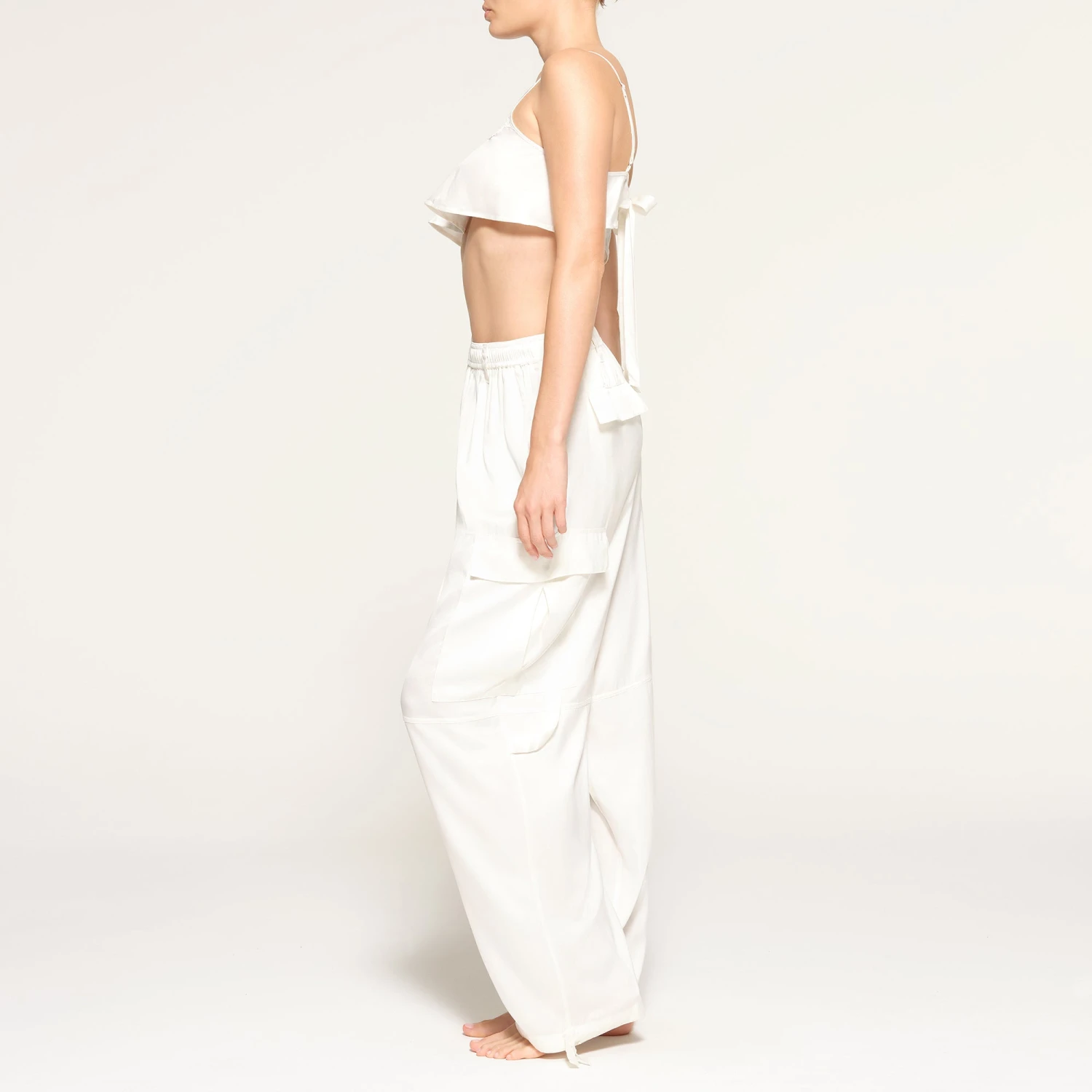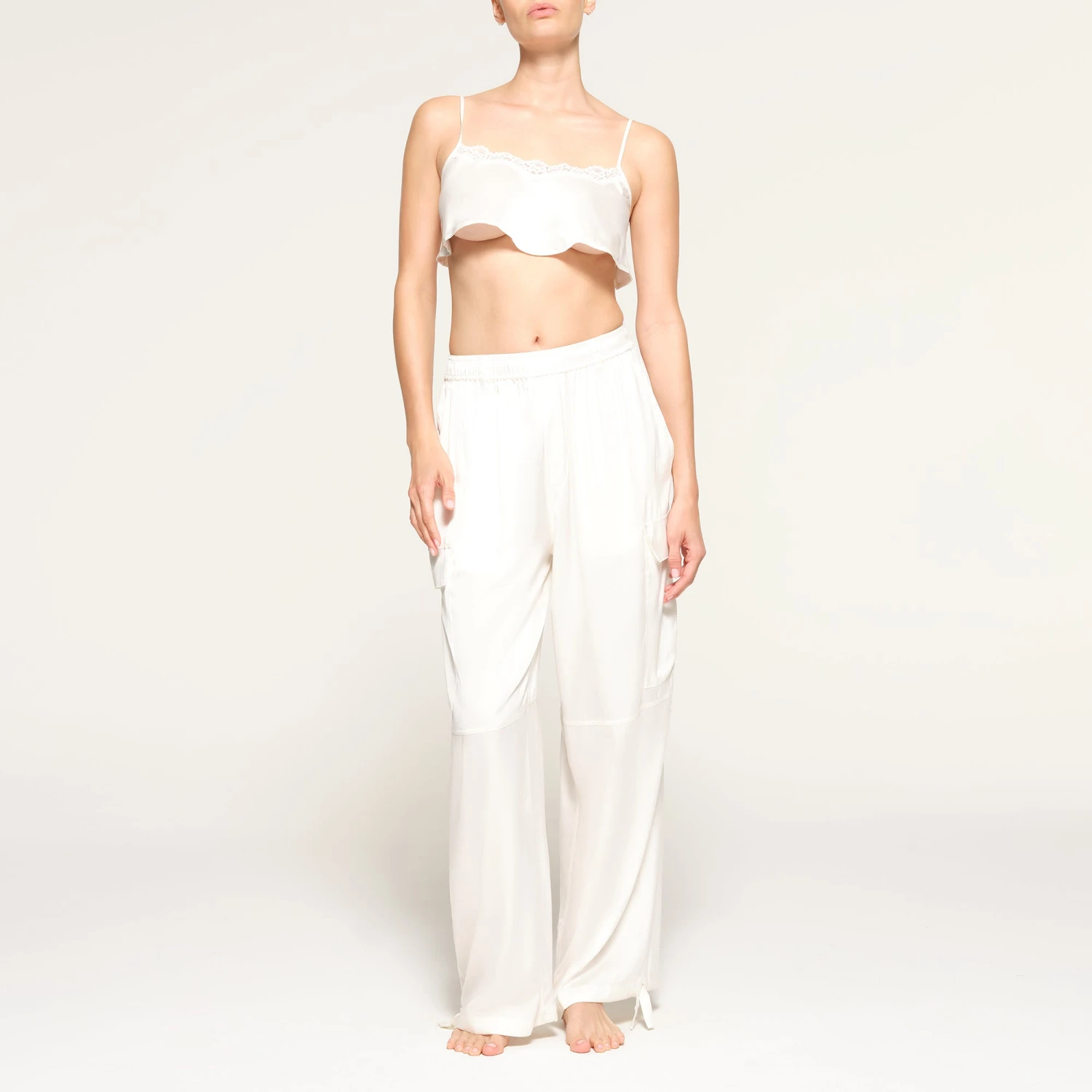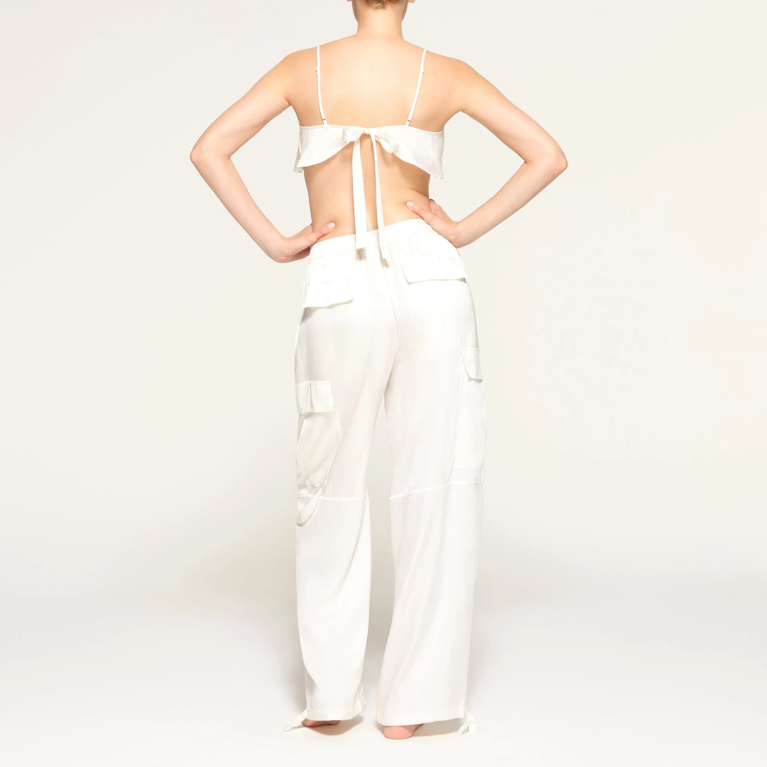 have a silky smooth feel and an effortlessly cool oversized fit. Features an elasticized waistband, side seam and cargo pockets, two back pockets, and a drawstring at the leg opening. Fits true to size.