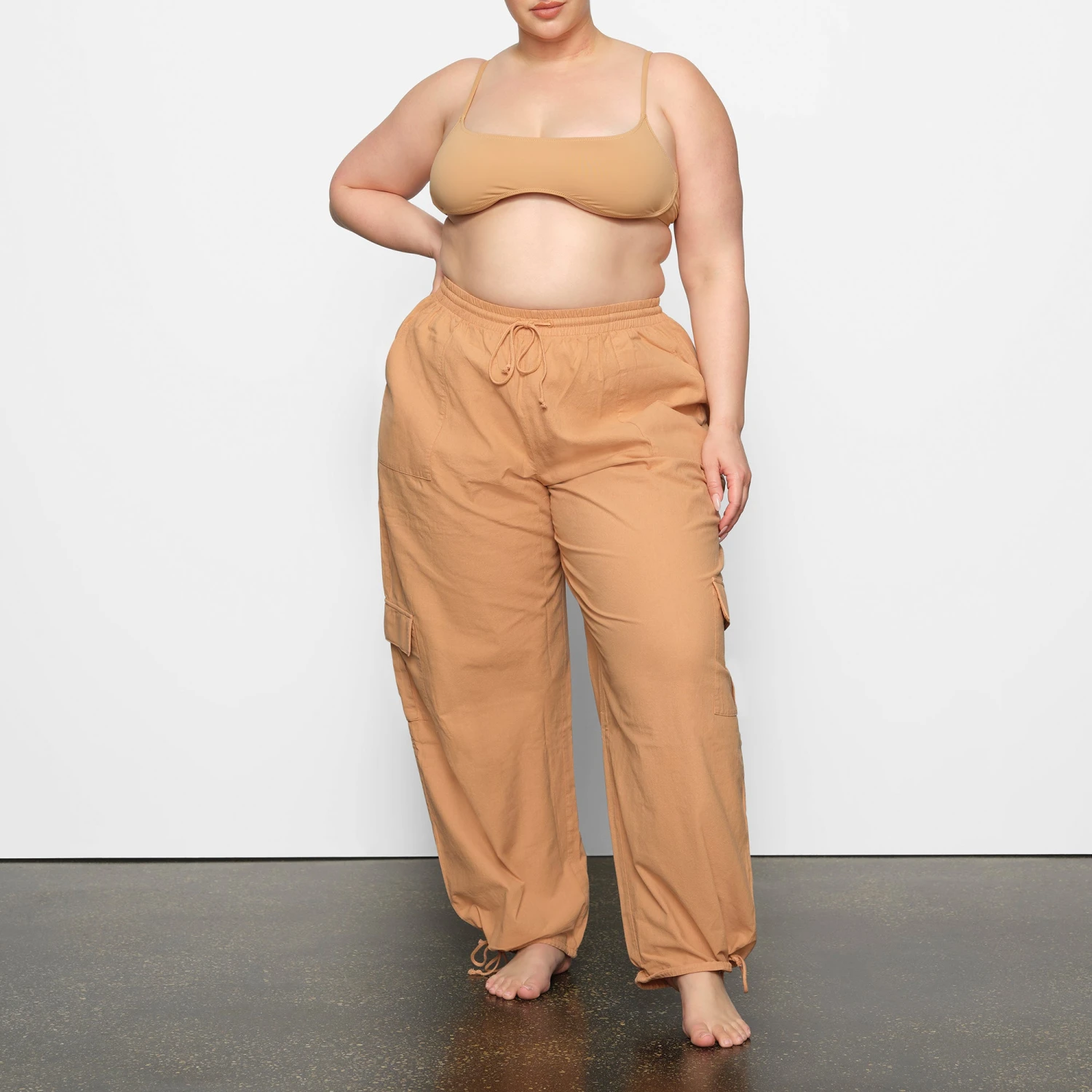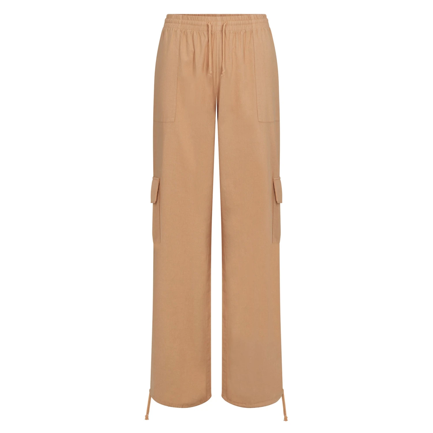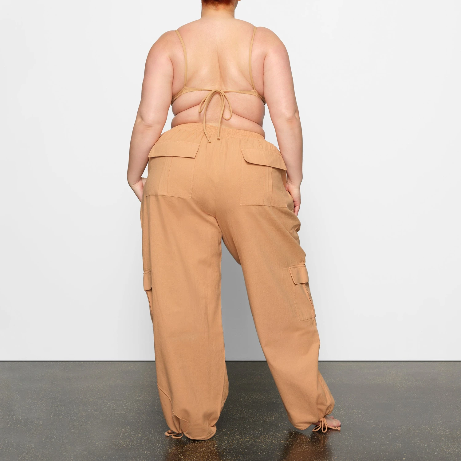 . This low-rise style features an elastic waistband with adjustable front drawstrings, spacious cargo-style pockets with hidden buttons, and drawstring details at the bottom leg opening. Fits true to size.