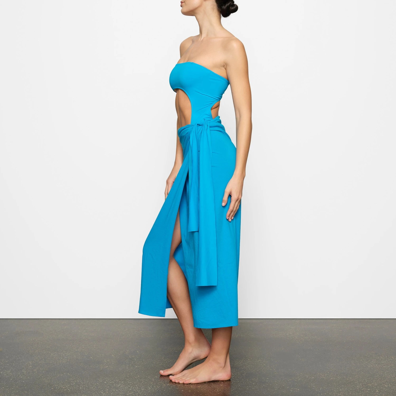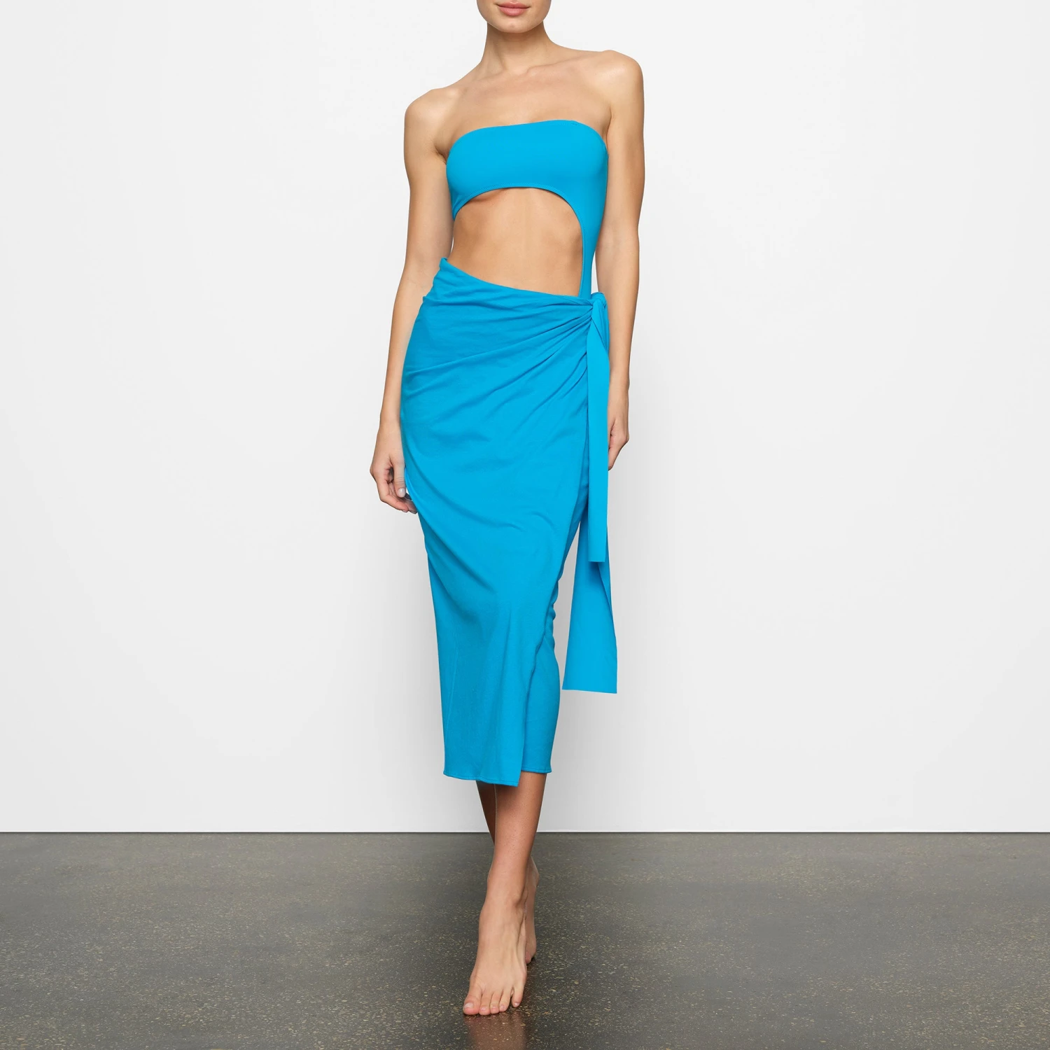 in a variety of ways for elegant looks apres-swim and beyond. Features a raw edge waistband with a side tie. Fits true to size.