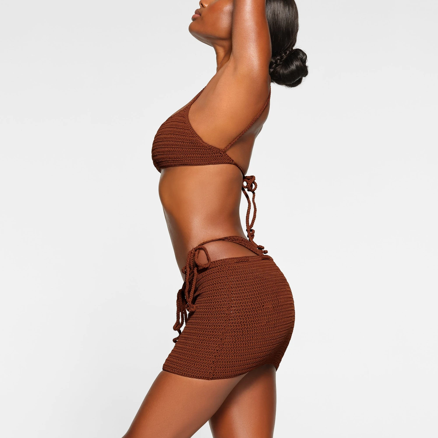 material hand-knitted together with a luxe crochet fabric for a low-rise micro-length