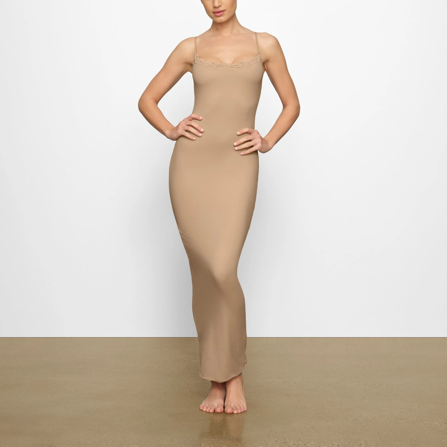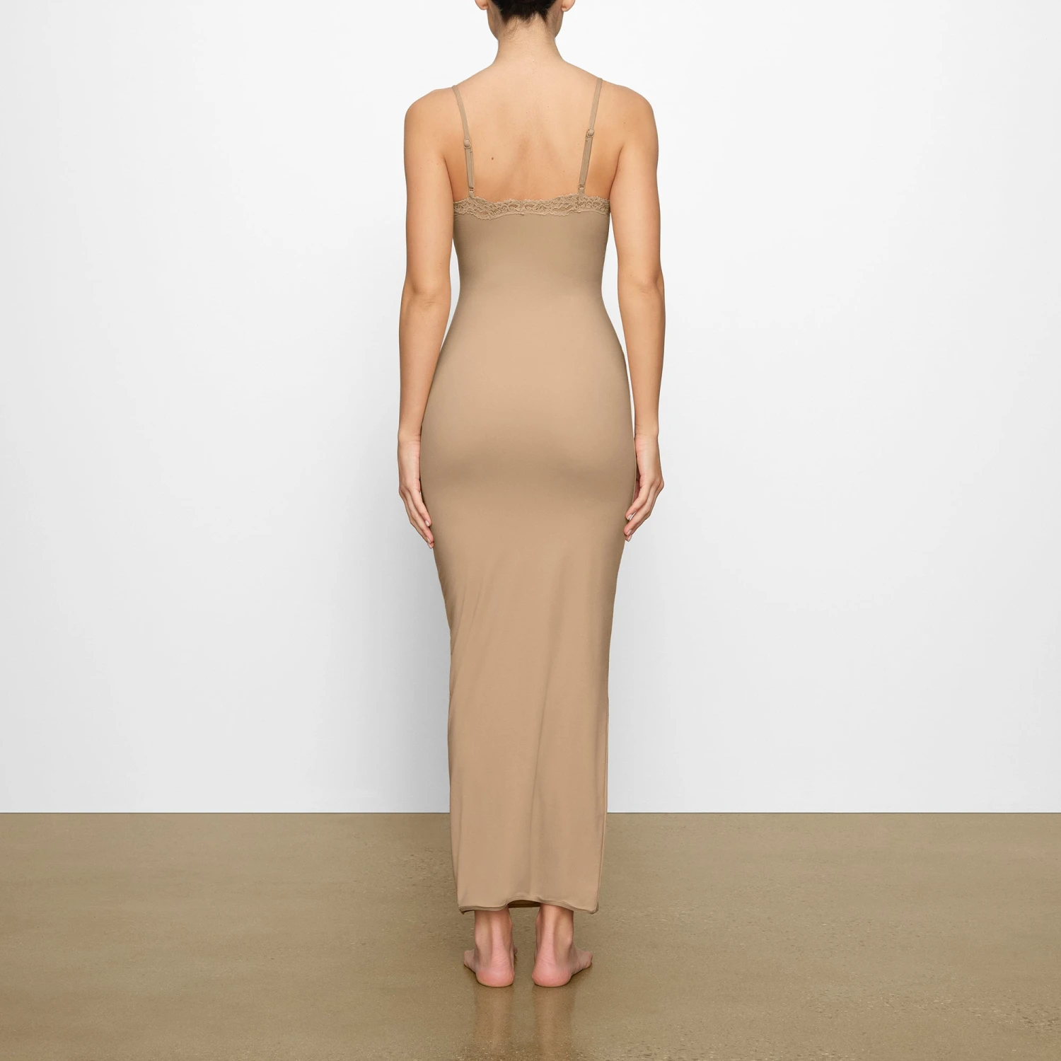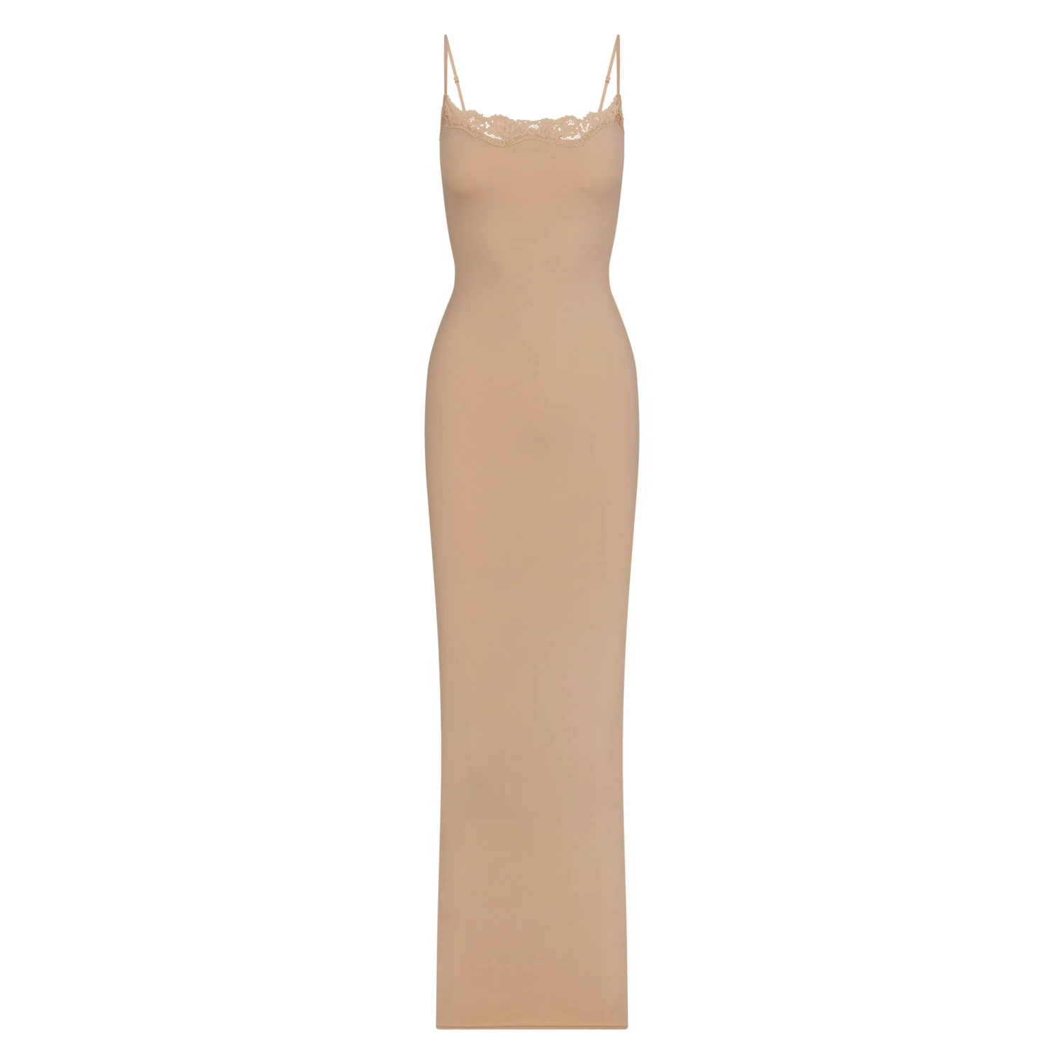 the perfect femme touch. This buttery-soft, ultra-flattering maxi is double-lined with adjustable straps and a front scoop neckline. Fits true to size.
