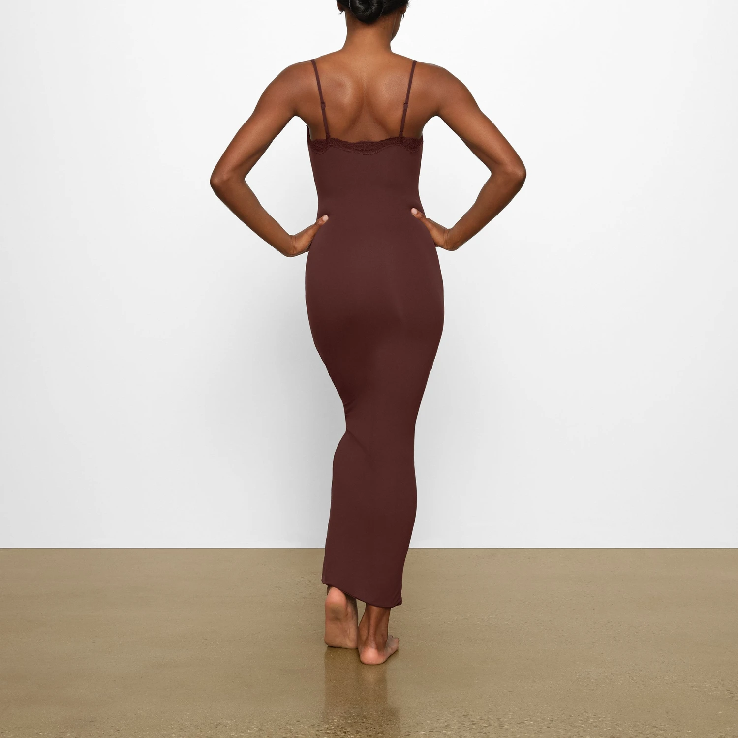 the perfect femme touch. This buttery-soft, ultra-flattering maxi is double-lined with adjustable straps and a front scoop neckline. Fits true to size.