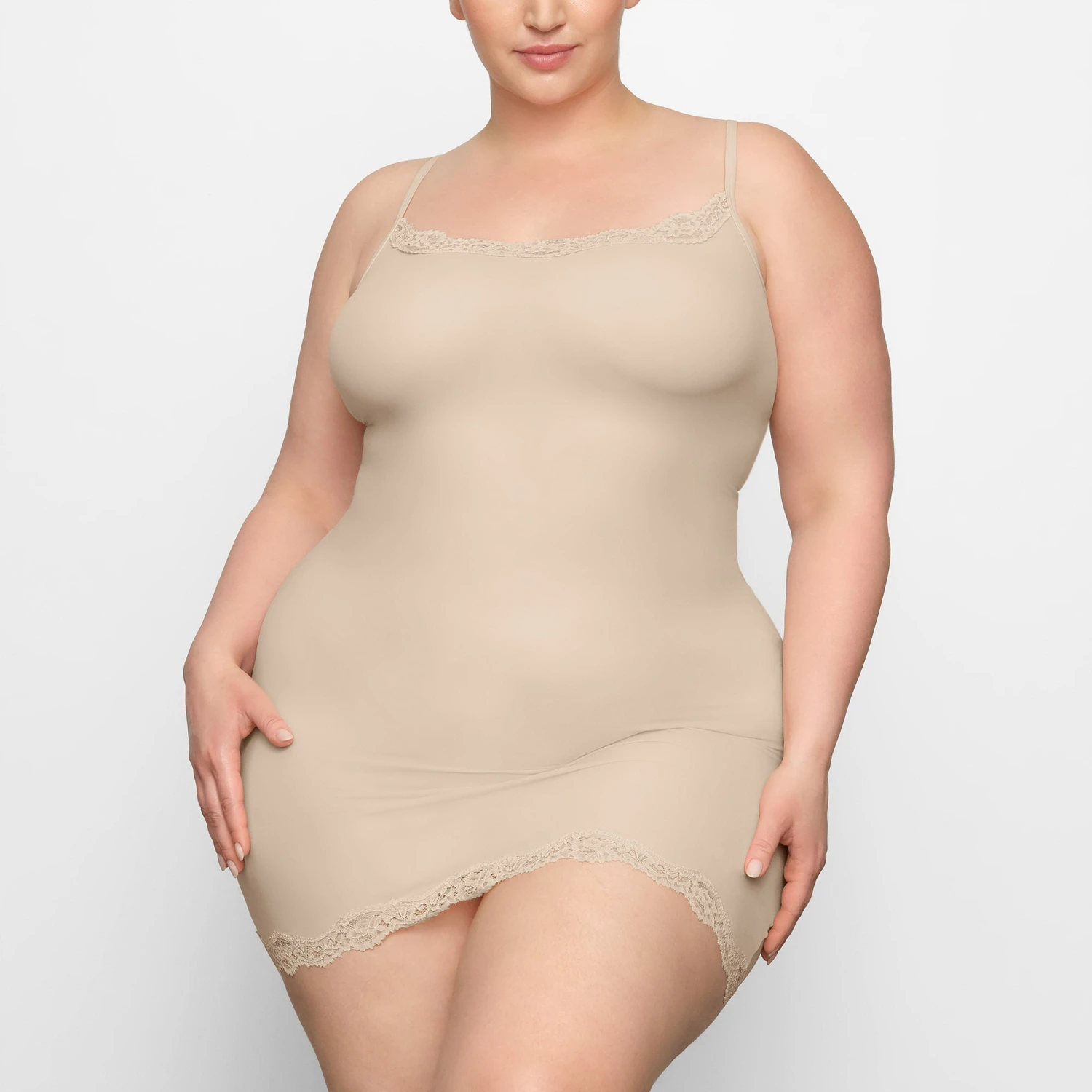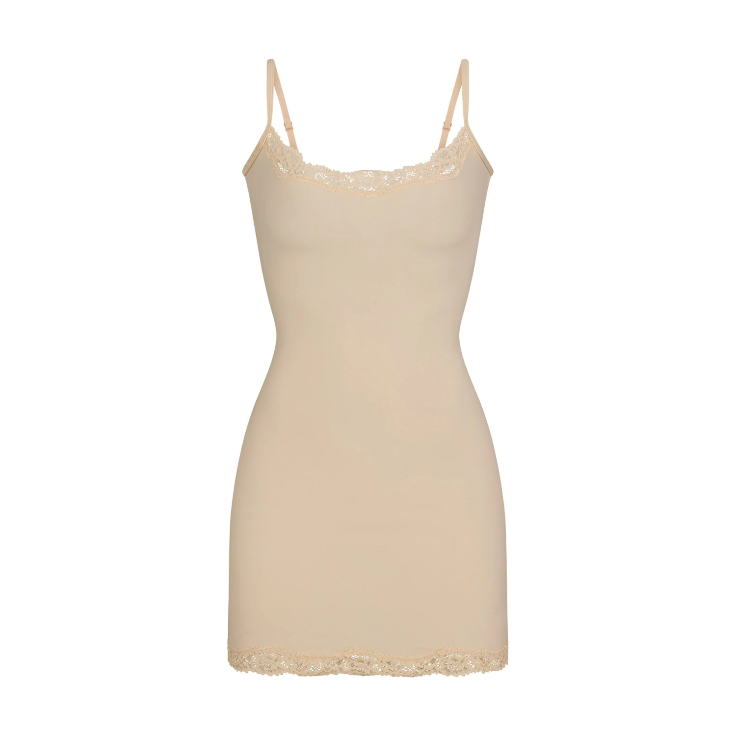 with romantic lace trims. Features a front scoop neckline and adjustable straps. Fits true to size.