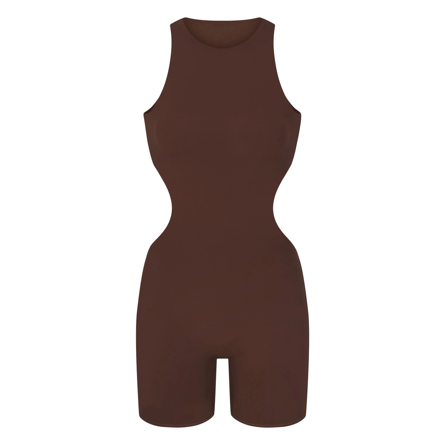 Your hottest plans call for this effortlessly sexy, buttery-soft onesie with a high neckline, large cut-out details at the sides, and an open back. Features double lining and perfectly pairs with our Barely There Cut out Mid Thigh