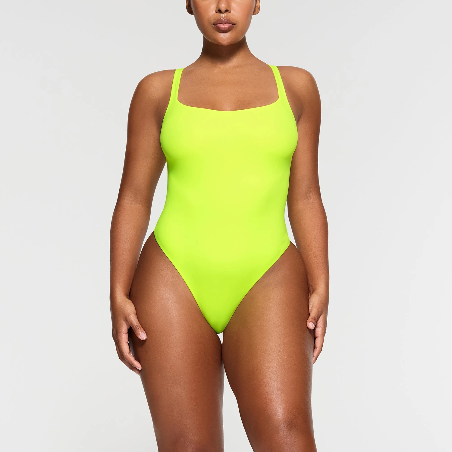 A square neckline and low scoop back make this
