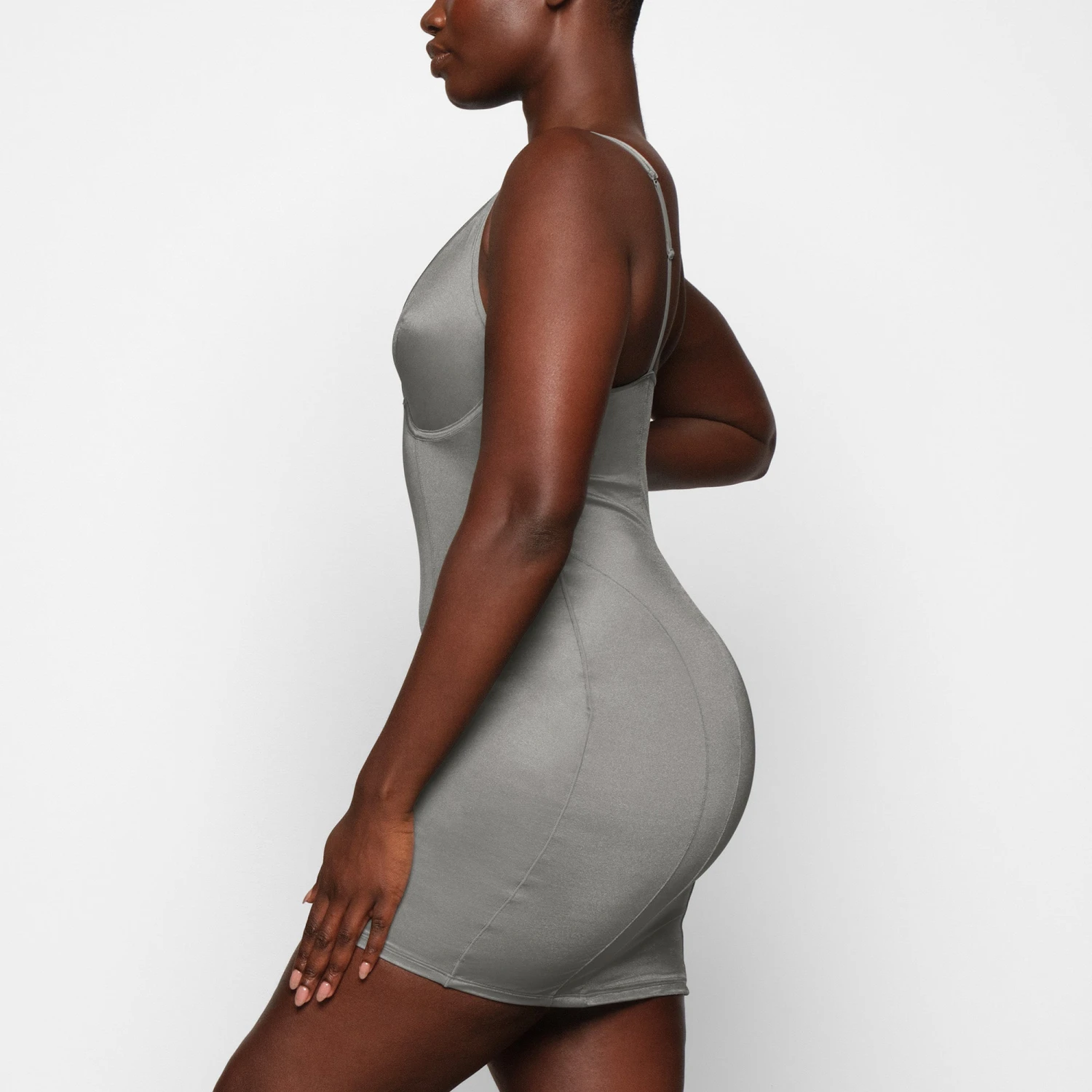 of the season! This sexy, slightly sheer mini dress is a pullover style with a plunging v-neckline, front and back seam details, and lightly lined supportive underwire cups. Fits true to size.