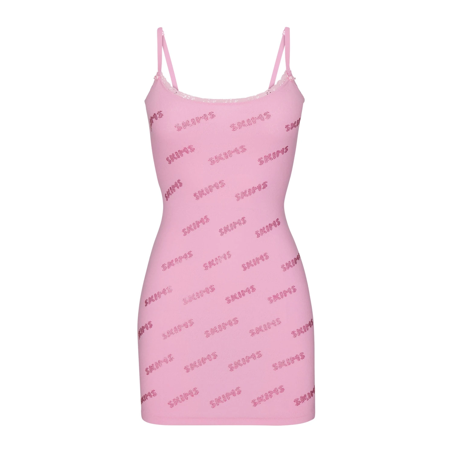 has delicate lace trims along the neckline and arm opening and repeating SKIMS logo with the prettiest rhinestone details. Features a wide scoop neckline, adjustable straps, and rosette accents at strap peaks. Perfect to wear layered or on its own. Fits true to size.