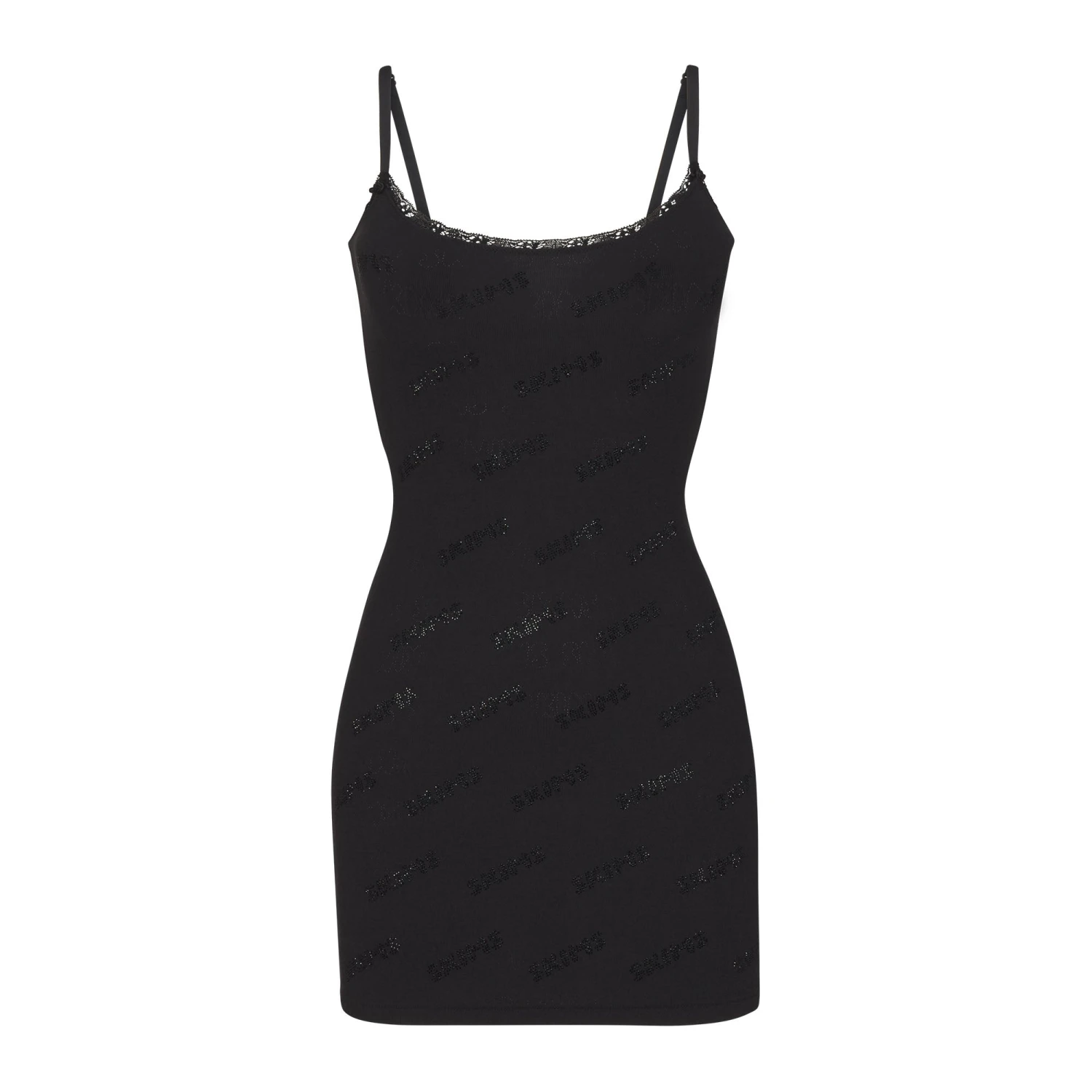 RHINESTONE LOGO POINTELLE MINI SLIP DRESS | ONYX