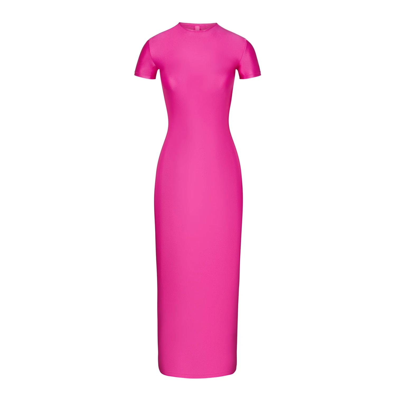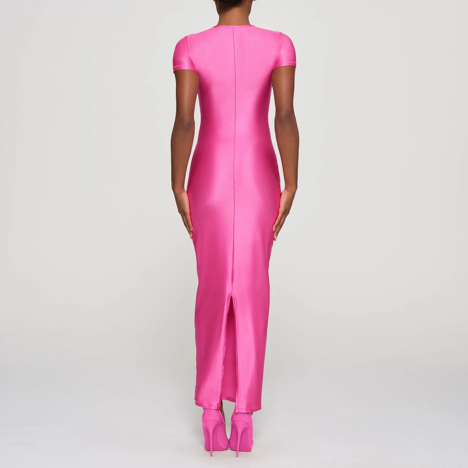 You’ll glisten with every step in this form-fitting, high crew neck maxi silhouette. Features a high crew neckline and a slit at the center back for mobility. Fits true to size.
