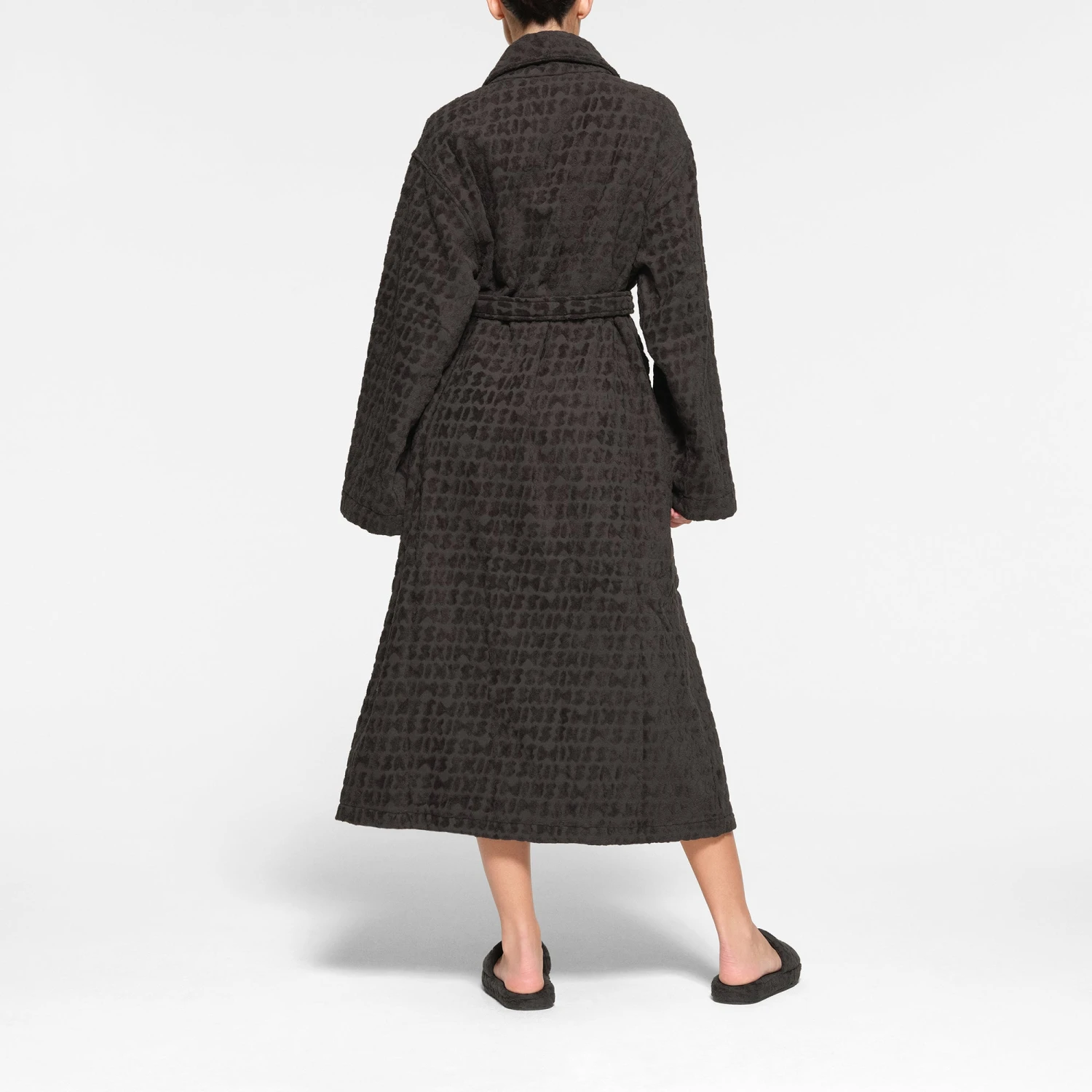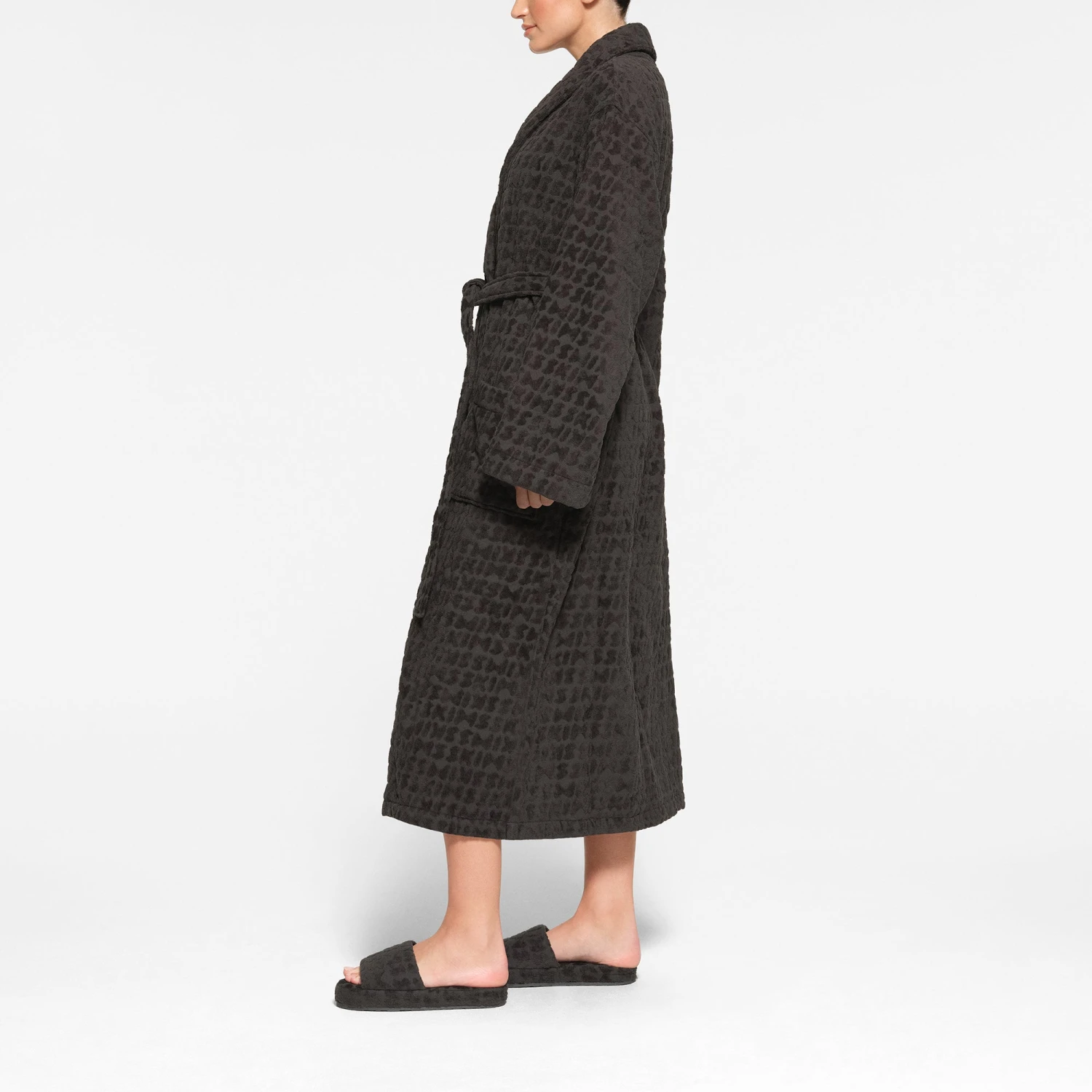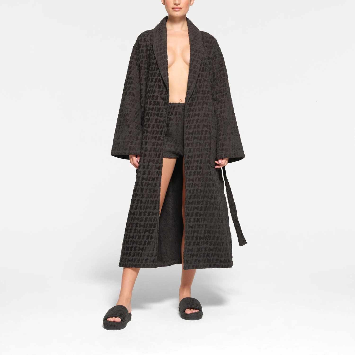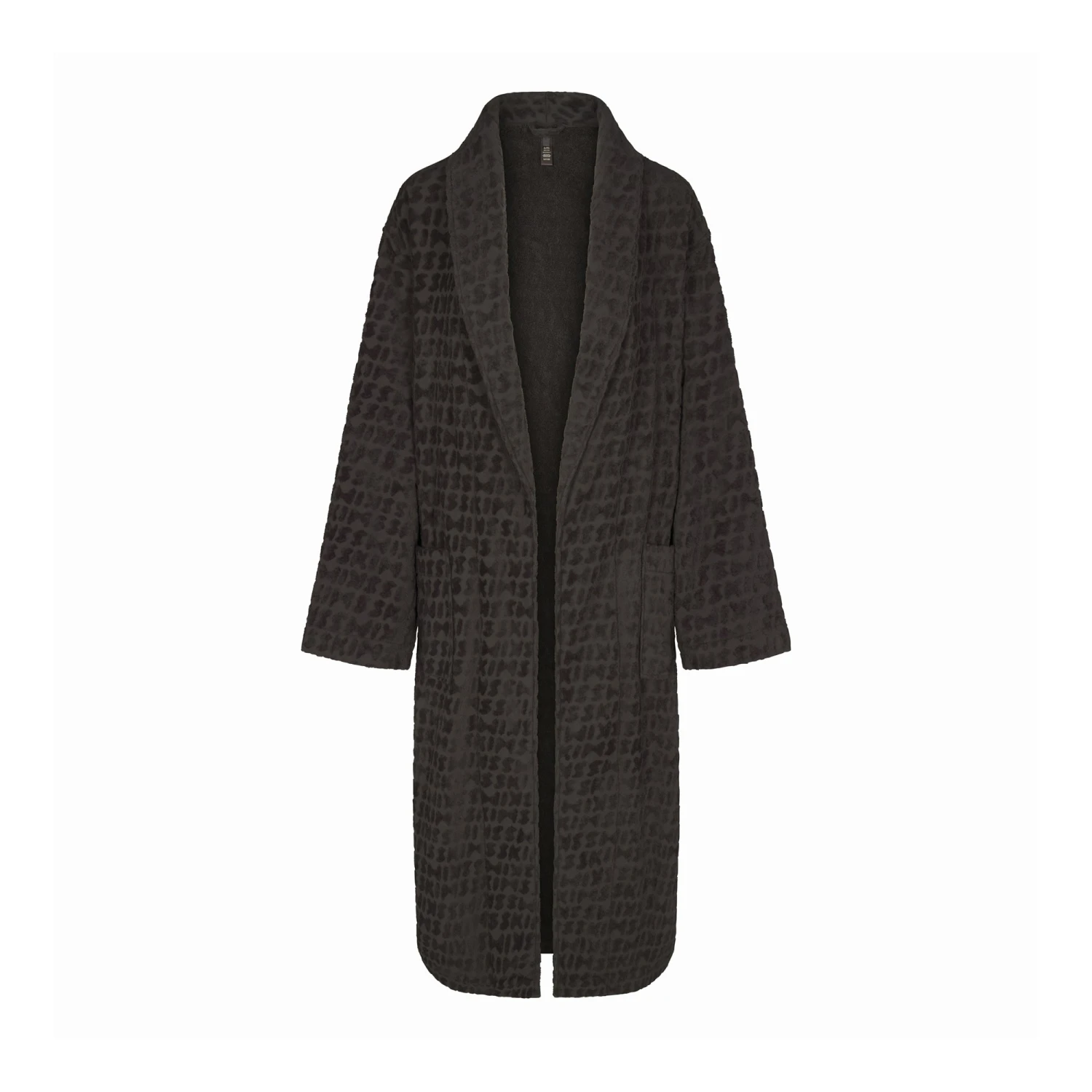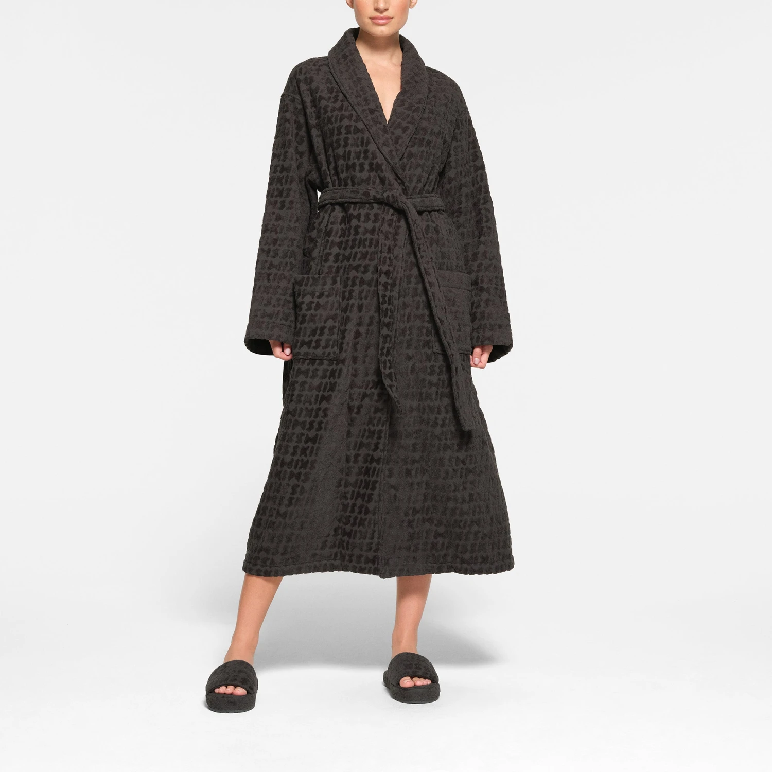 with all-over SKIMS logo details will have you lounging in ultimate luxury. Features two front pockets, a tie with belt loops, and a loop at the back for easy hanging. Fits true to size.