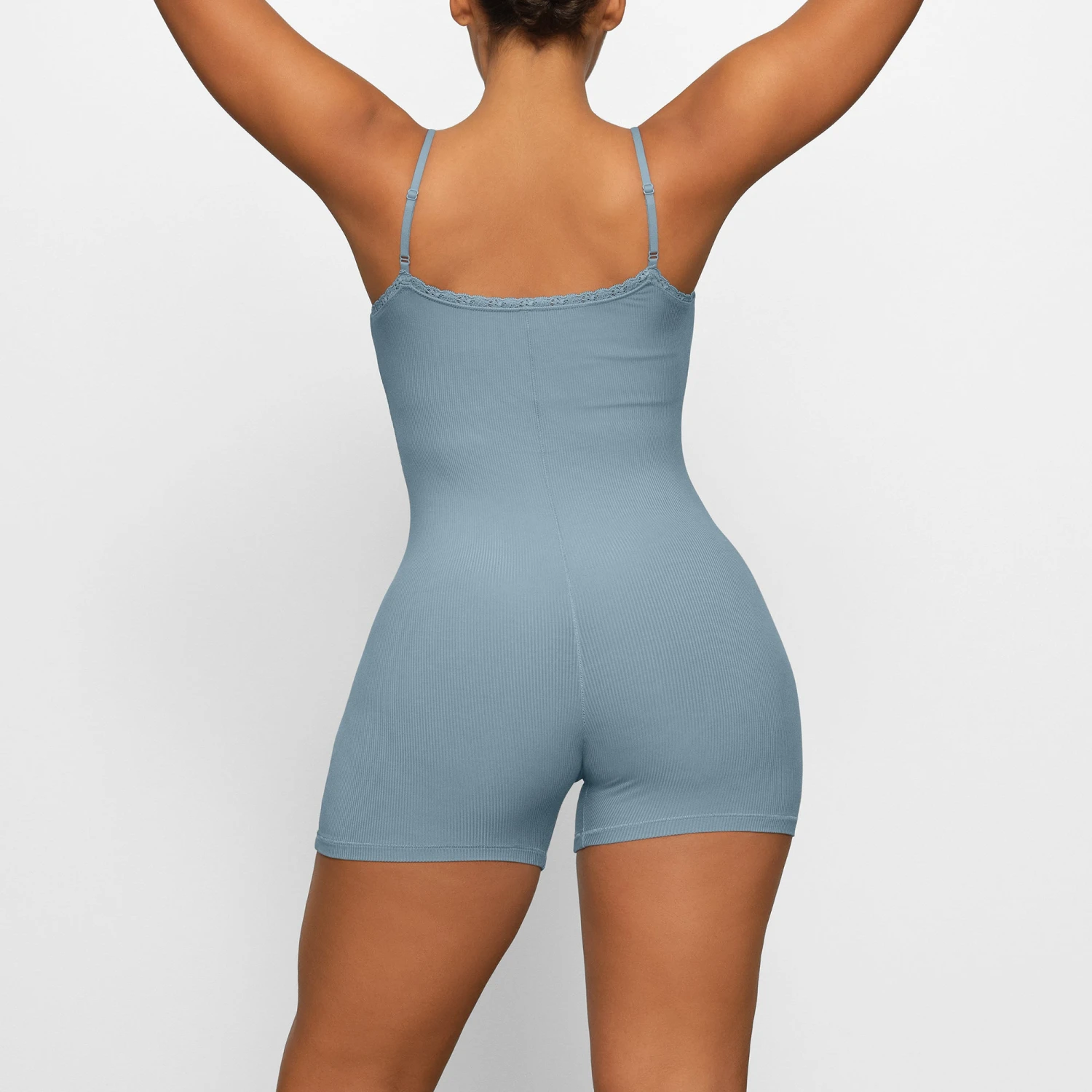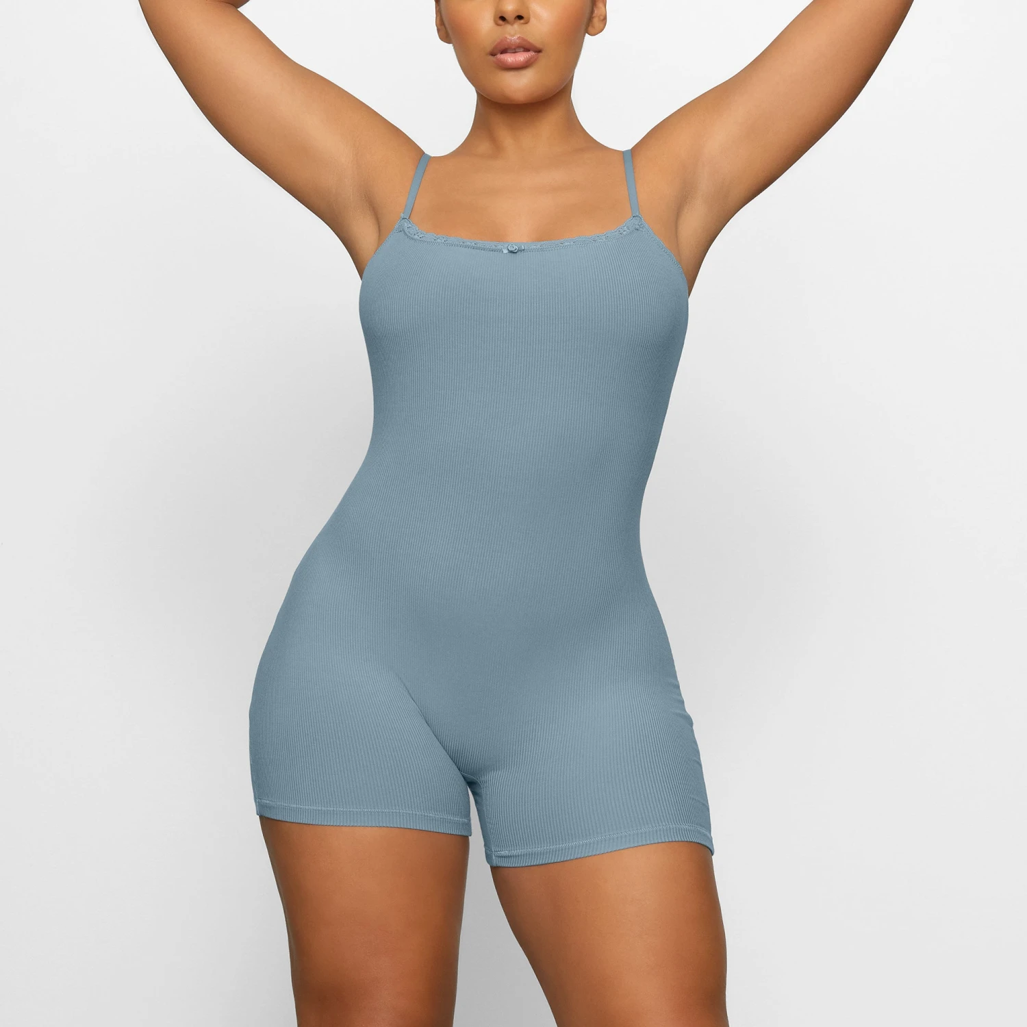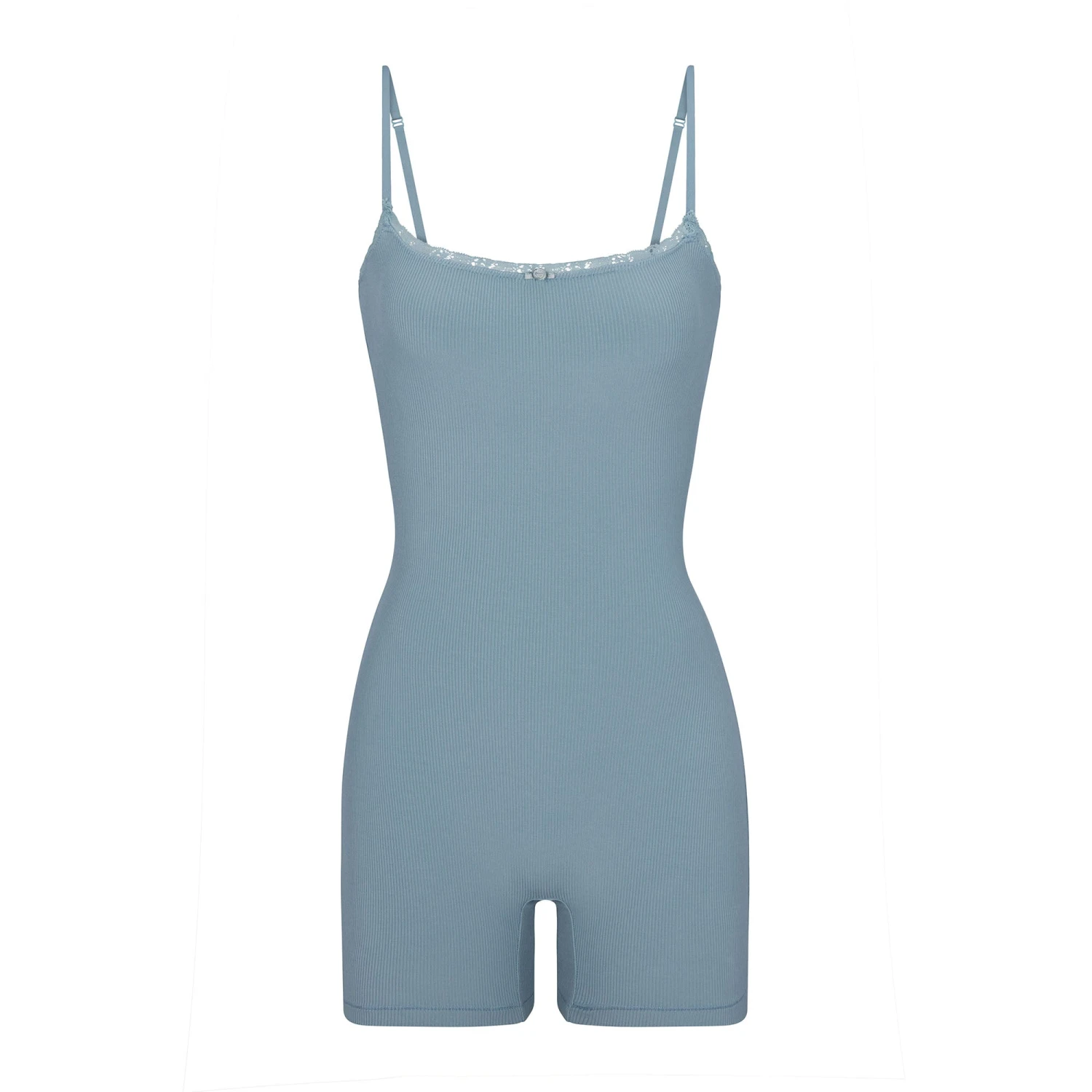 with romantic lace details along the neckline. Features adjustable straps, a shelf bra with light support, and a feminine rosette detail along the center front. Fits true to size.