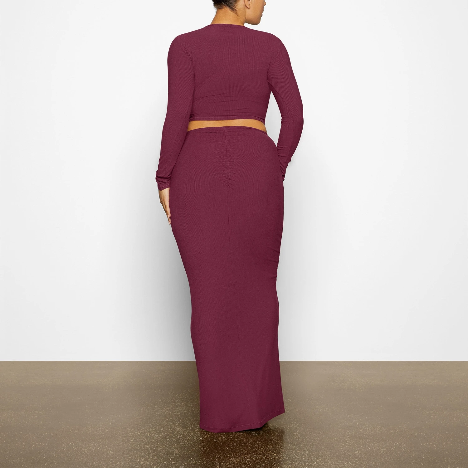 A super soft, stretchy, fitted maxi skirt in our viral Soft Lounge fabric. Features front ruched details and adjustable drawstrings so you can choose how much (or little) you want to show. Features center back ruched details. Fits true to size.