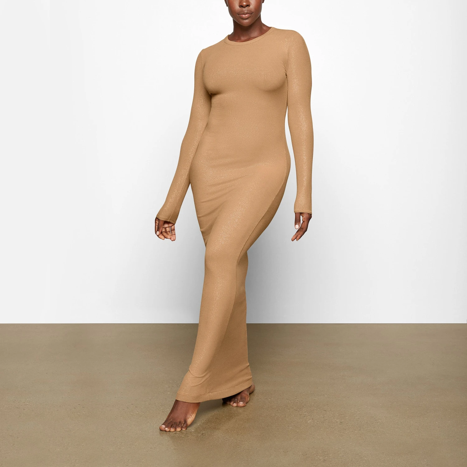 now has the perfect amount of shimmer and a classic crew neck silhouette. You’ll love how this body-hugging maxi dress fits and feels every time you slip it on. Fits true to size.