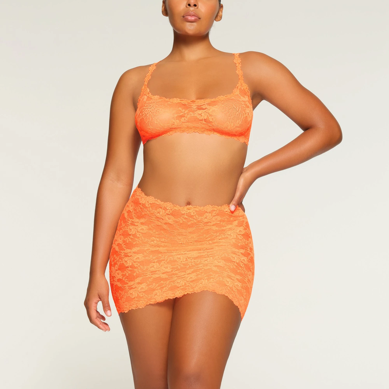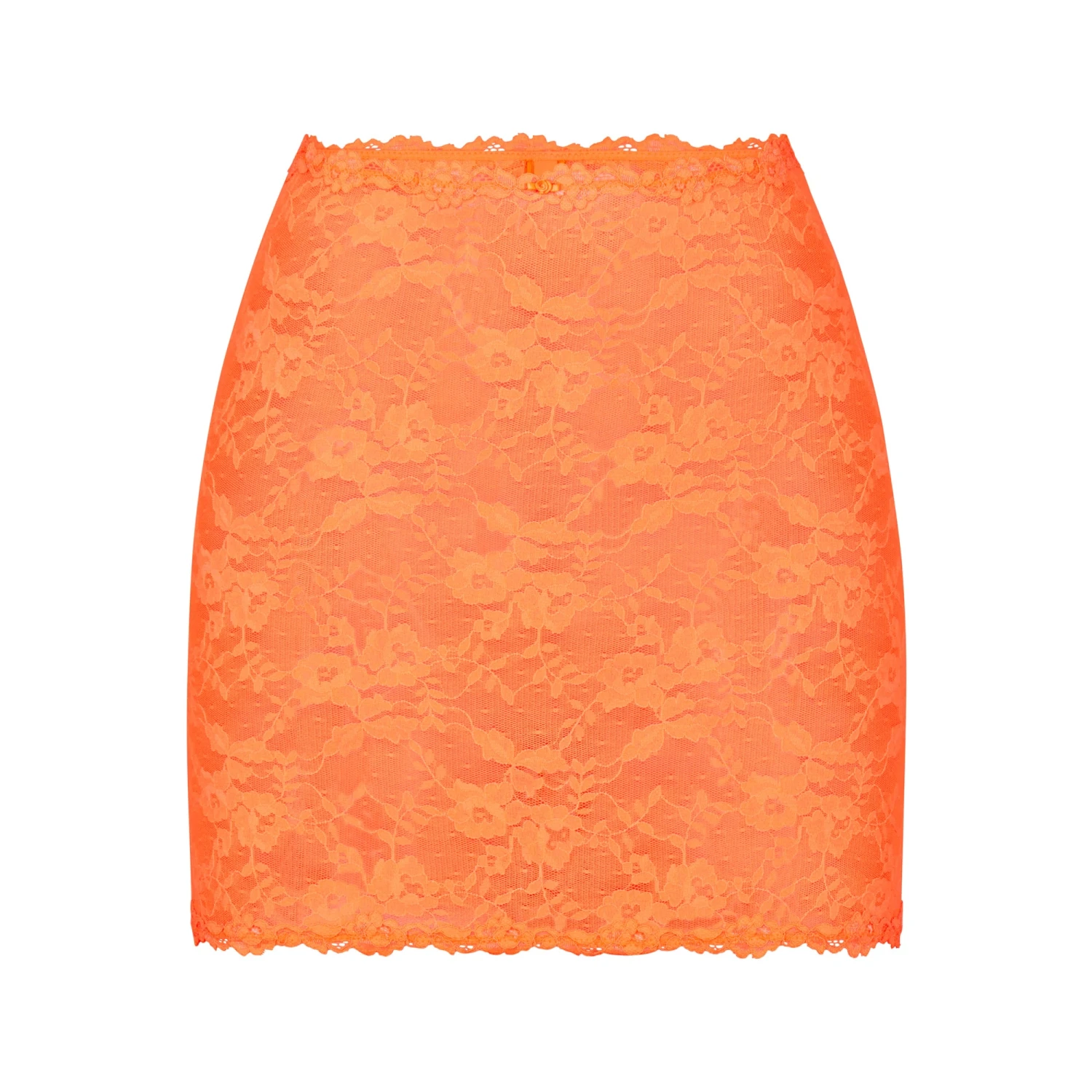 has delicate sheer, stretch lace fabric that comfortably hugs your curves for a statement-making look. Features luxe lace trims along the waist and bottom hem and rosette detail at the center front. Fits true to size.