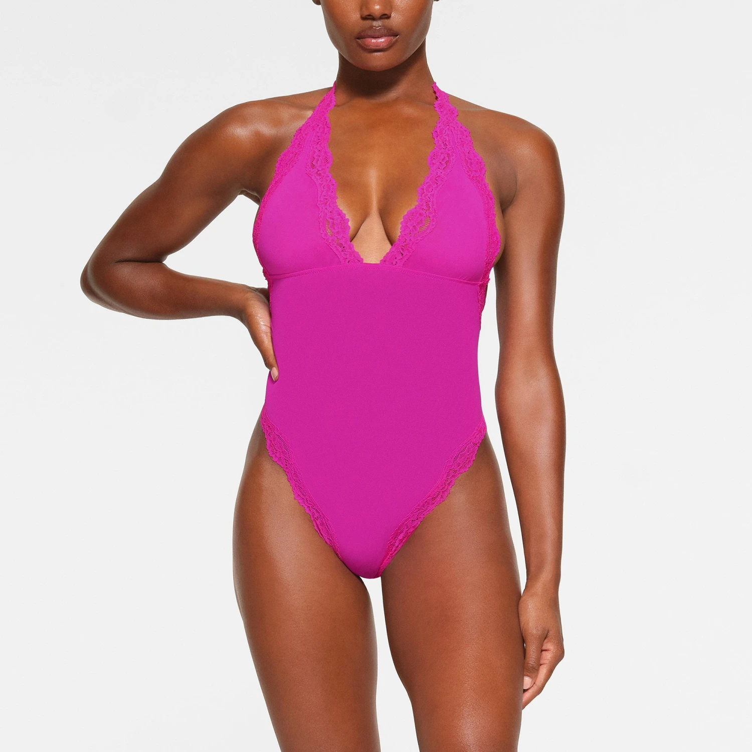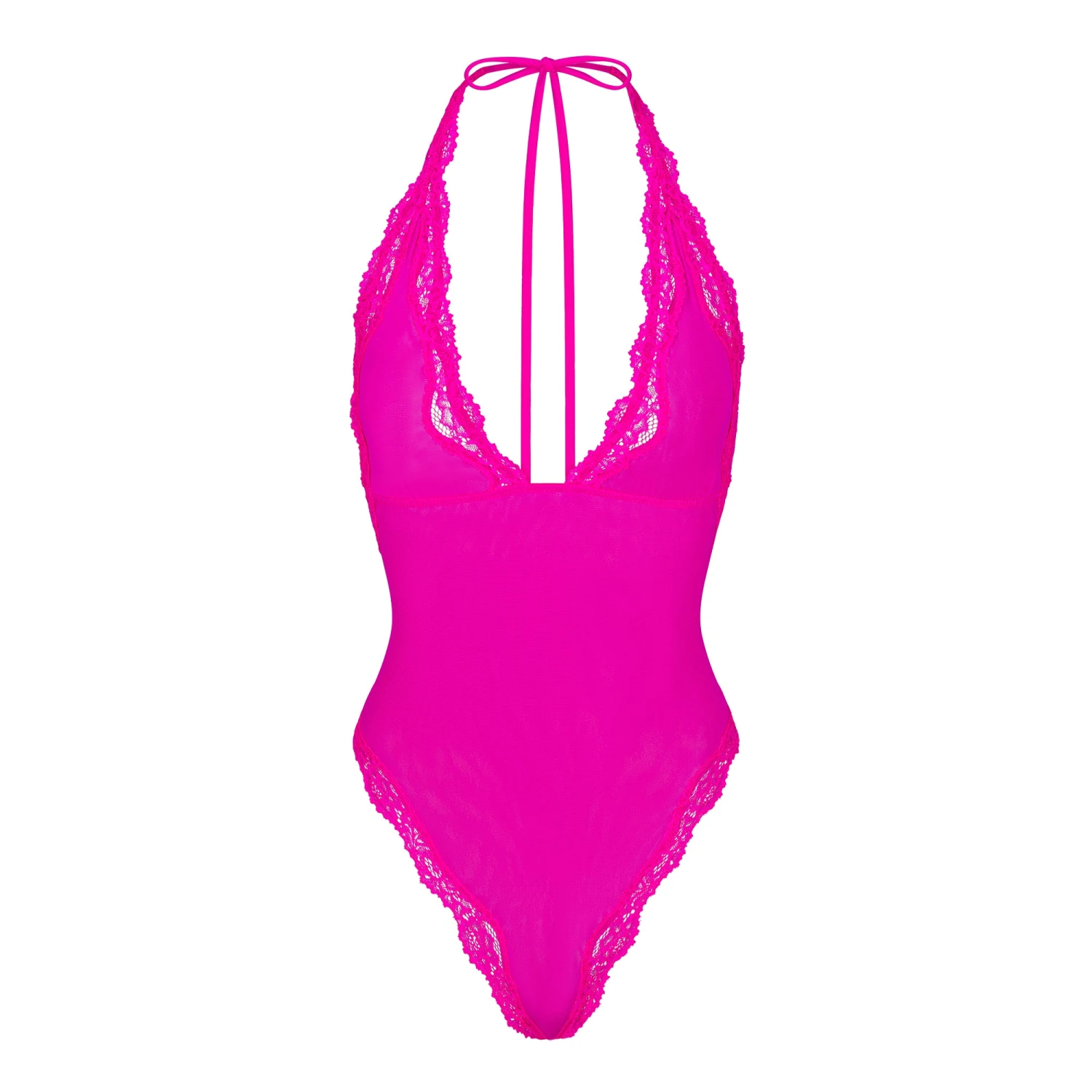 SUMMER MESH LACE DEEP PLUNGE THONG BODYSUIT | FUCHSIA